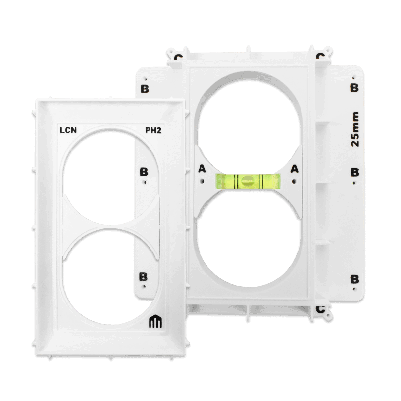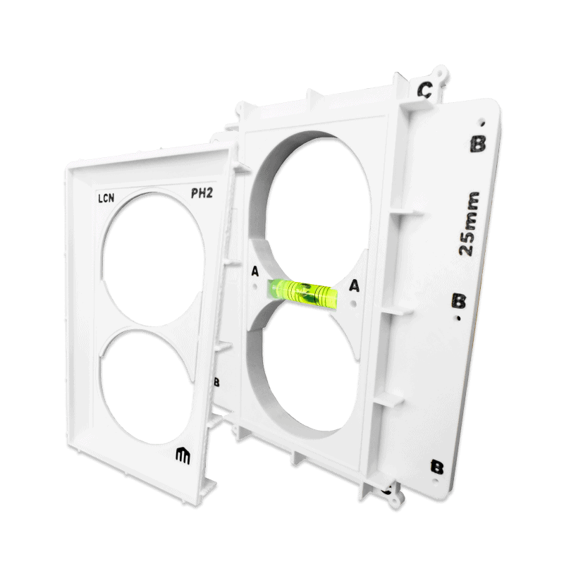 Der Einbaurahmen LCN-PB2 ist für den Planeinbau von LCN-GT-Tastern wie dem LCN-GT10D, LCN-GT12 sowie für den LCN-GS55-2 vorgesehen. Mit dem LCN-PB2 ist es möglich, LCN-GT Taster flächenbündig in einer Betonwand zu montieren. Der Rahmen lässt sich wahlweise mit der mitgelieferten Doppel-Gerätedose oder zwei Einfachdosen verwenden. Für die schnelle und saubere Montage wird der LCN-PB2 mit entsprechenden Montagehilfsmitteln geliefert.